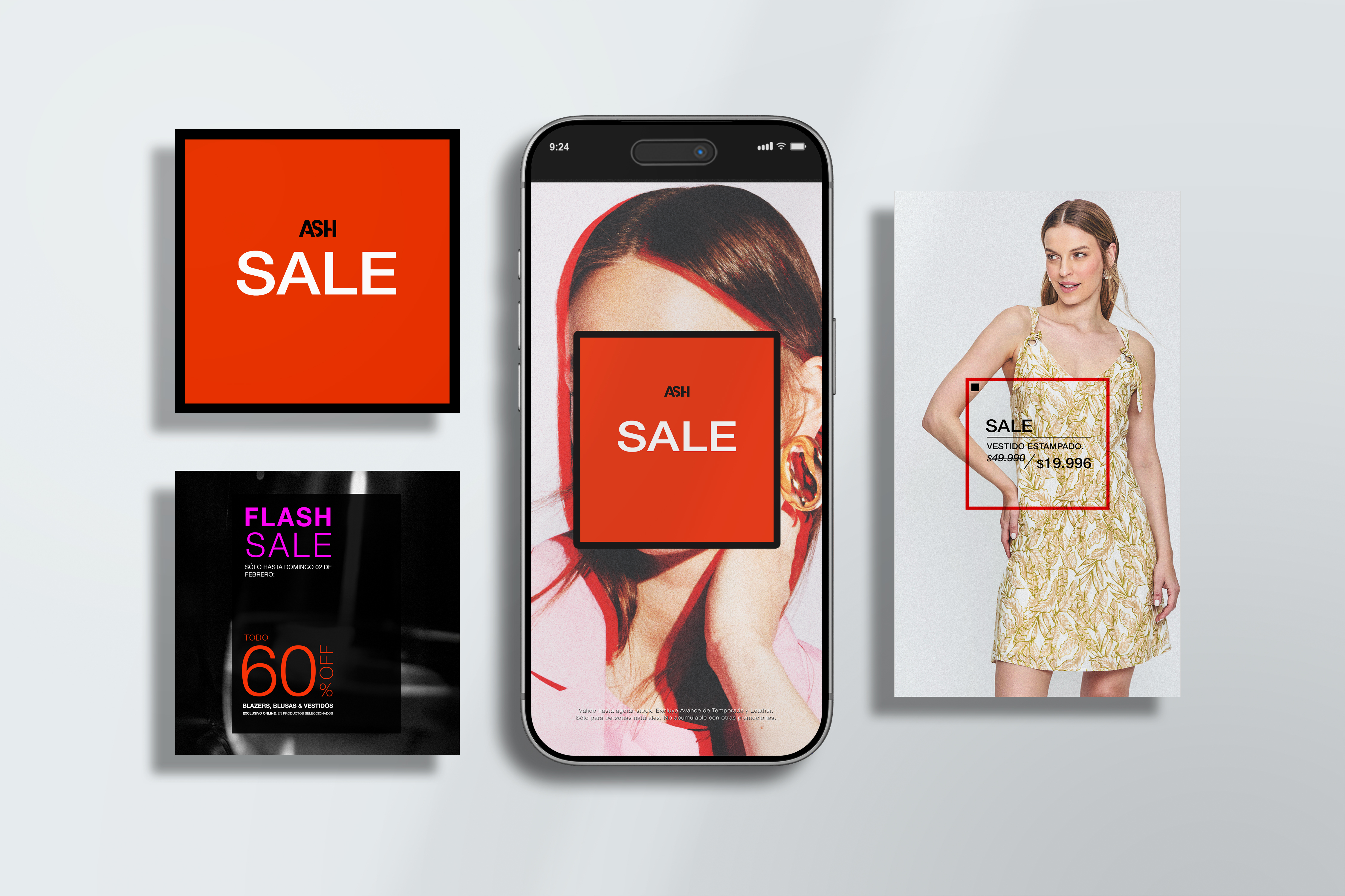 A curated set of graphic assets created for ASH’s various sale activations, all built upon a consistent visual system driven by orange red and black. This graphic line adapts seamlessly across multiple contexts — from Flash Sales to e-commerce and high-impact campaigns such as Cyber Monday — maintaining a clear, direct and recognisable identity in every format.